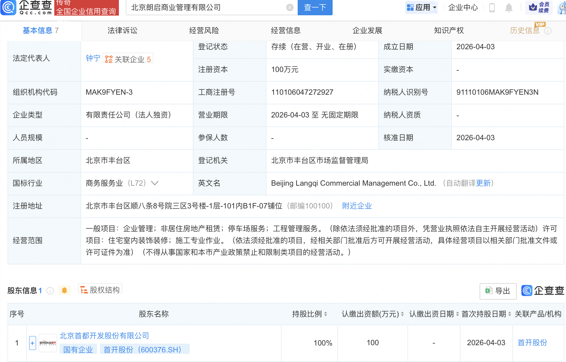 近日,北京卓第商业管理有限公司、北京朗启商业管理有限公司成立,经营范围均包含:企业管理;非居住房地产租赁;停车场服务;工程管理服务等。企查查股权穿透显示,二者皆由首开股份(600376)全资持股。